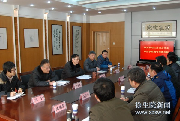 127日上午,江苏安全技术职业学院校长等一行7人,来我院进行考察交流。院长蒋留生、副院长刘明生、纪检监察副书记赵宇善、组织人事处副处长王宁等相关部门负责同志热情接待了客人。